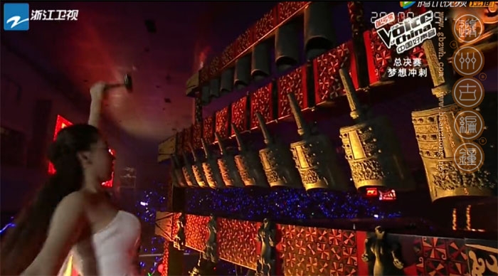 2014年10月7日,中國(guó)好聲音第三季北京總決賽在北京首都體育館成功舉辦,開場(chǎng)時(shí)一位身穿白衣的美麗女孩敲擊編鐘發(fā)出美妙的好聲音,這套編鐘就是由隨州市古編鐘文化發(fā)展有限公司制作的22件曾侯乙編鐘。